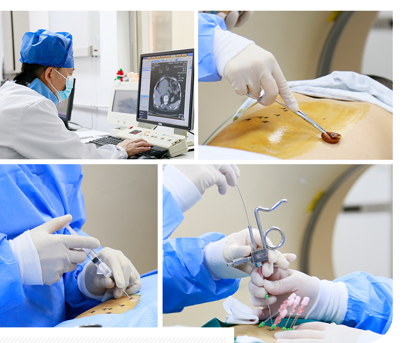 • 微创介入治疗是一种介于外科和内科之间的新兴治疗方法,在高端的数字减影血管造影机(DSA)、CT、核磁共振、超声等设备精确引导下,无需开刀,在皮肤上做直径几毫米大小的微小通道,经人体原有的管道,用穿刺针、导丝、导管、支架等精密器械对肿瘤病灶局部进行微创治疗。